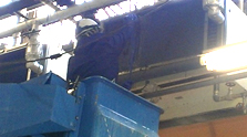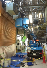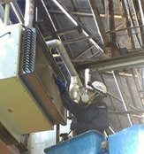 ①周囲の養生及びKY、各種標示等全ての安全措置を講じ、有資格者が高所作業車を操作し作業を行います。 まずはフィン表面に堆積した粉塵を掃除機で吸い取ります。 |