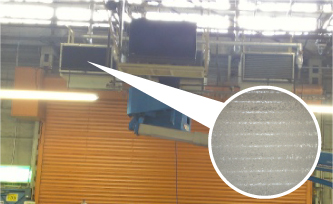 上:エアカーテン全景(地上5.5mの高さに3台設置) 下:フィン表面に堆積したホコリ (通風悪化の原因) |